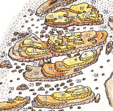 (3)地形:沖に向かって大きい4つの根がのびている(どの根もトップが5m、アンダー25~30m)ソフトコーラル、ハードコーラル、水路、オーバーハング水底は砂地~転石
